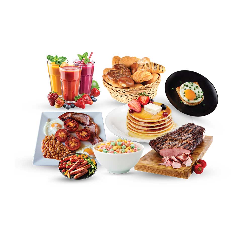 Eggs Preparation, Breadbasket, Cereals, Yogurt, Juice Choice of Freshly Squeezed juices or Sliced Fruits
